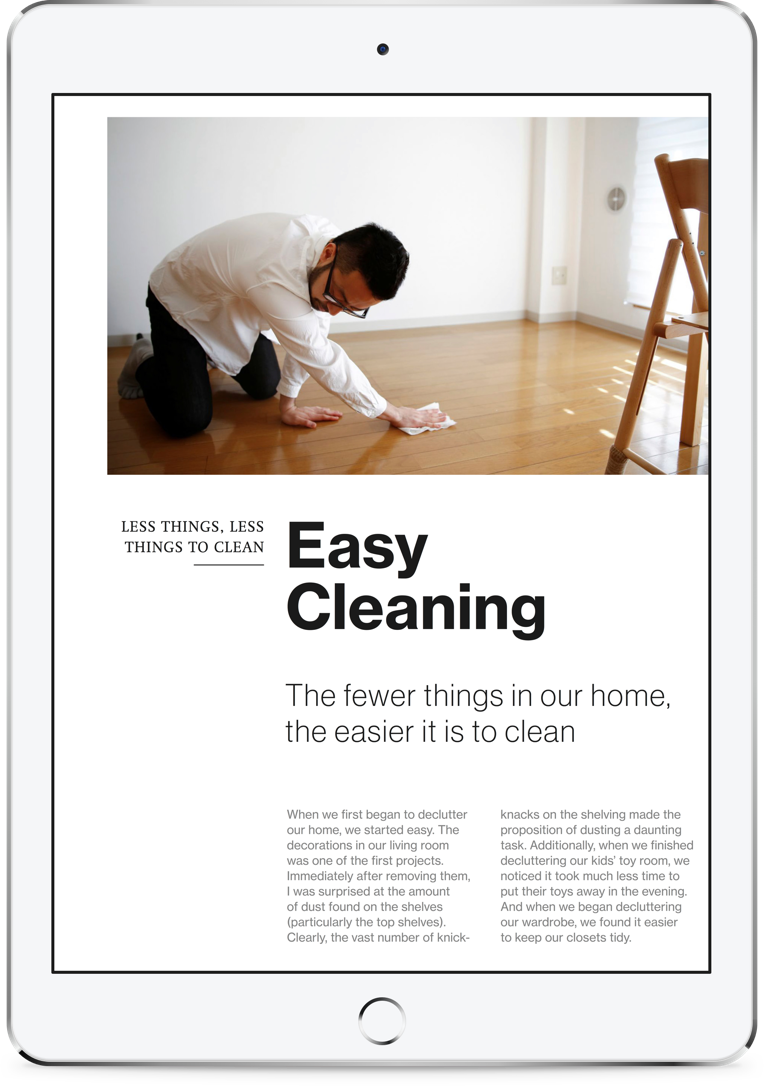 The improved quality in one’s life with minimal living is emphasized. Stress is reduced, more time is available and you can focus on the things you love doing.