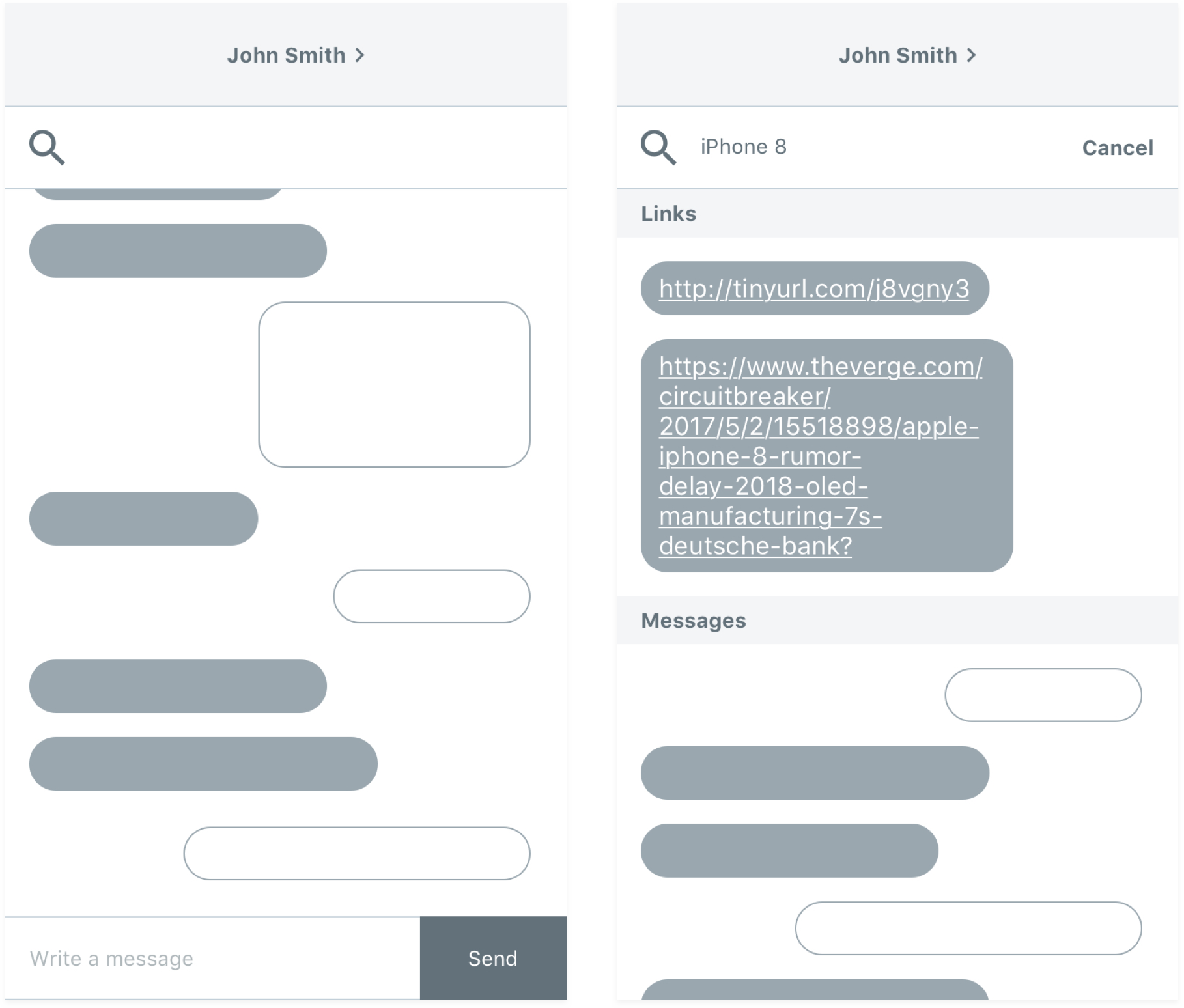 A search bar that surfaces content within the current conversation. Users can type in keywords to bring up either content (images or links) and messages. Technical questions arise: How do images and links have keywords associated with them?