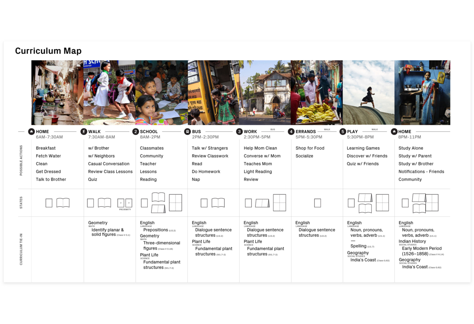 We took a look at Android’s App model system and realized that discovering quality educational Apps would be a barrier to Aditi due to the sheer number of Apps in the store. We removed the App model and created a new version of Android that could stream content from Apps based on what she was doing, her location and the time of day.