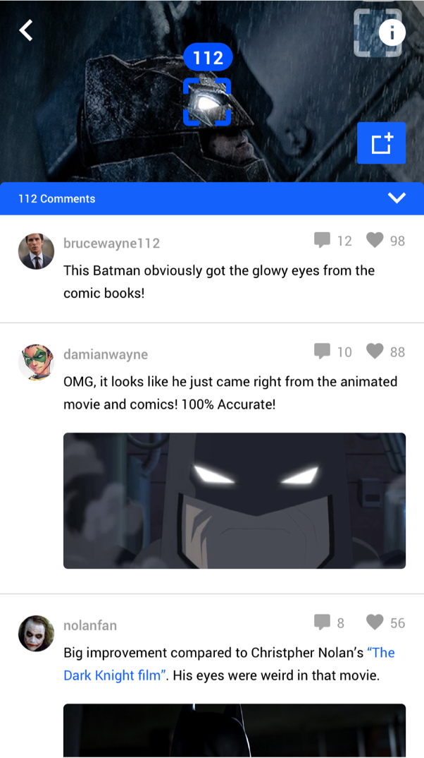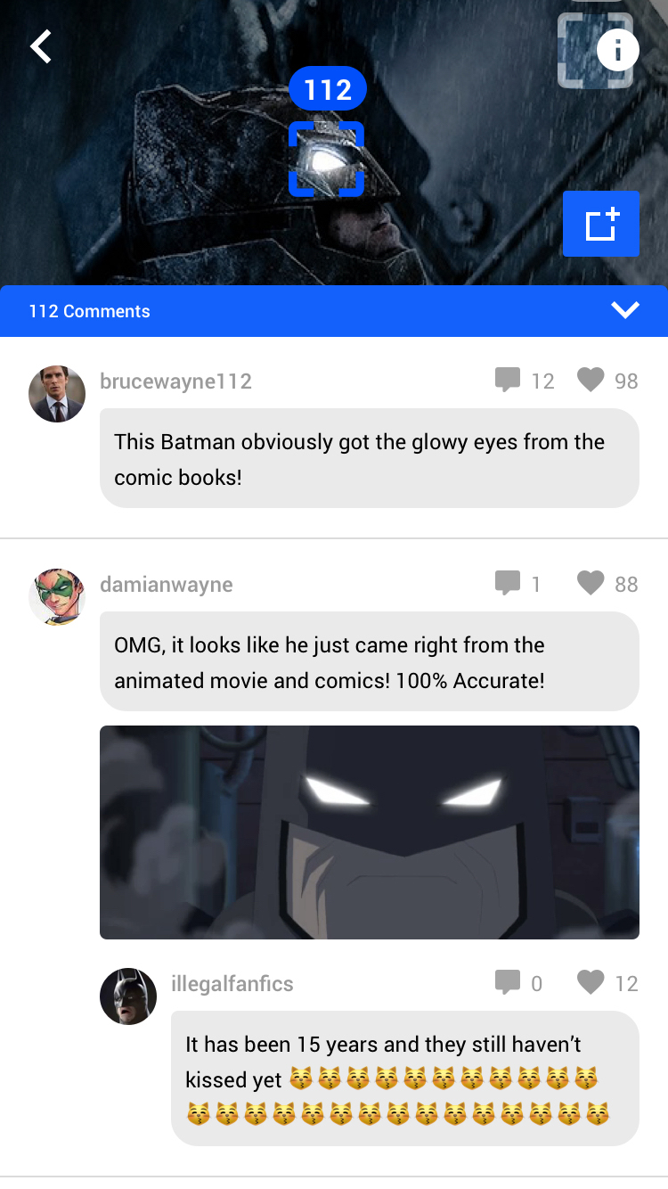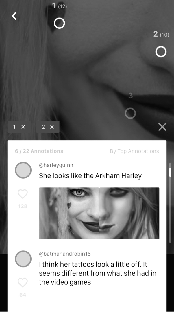 With the issue of fans not being able to attend live video discussions, I decided to go back to using text as the primary form of communication and add features that would simulate a real-time conversation. From my previous ideations, user-testers liked the idea of annotating on a specific part of a video or photo because it reflected the experience of pointing to something and talking about it to people in person. I primarily felt this would be valuable for fans because their references would be a lot more clear and expressive; especially when being in a fandom is a very visual experience. The challenge was figuring out how long comments would scale.