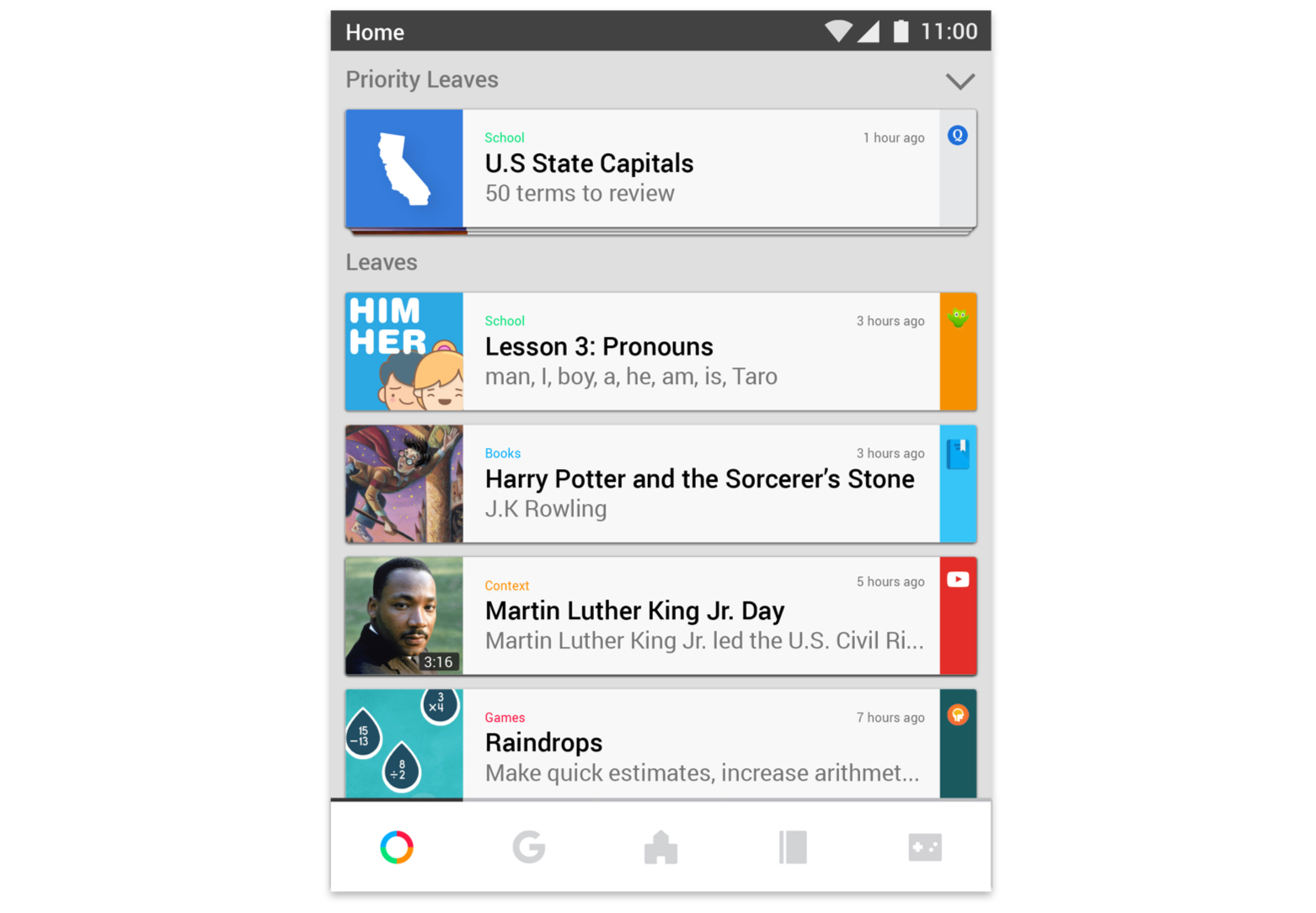 We took a look at Android’s App model system and realized that discovering quality educational Apps would be a barrier to Aditi due to the sheer number of Apps in the store. We removed the App model and created a new version of Android that could stream content from Apps based on what she was doing, her location and the time of day.